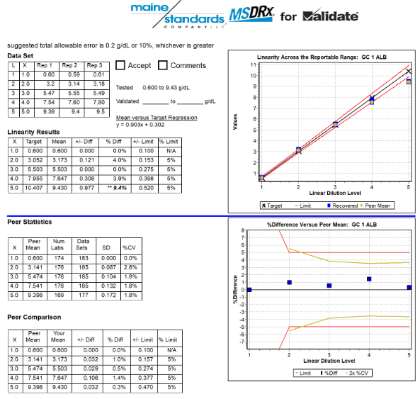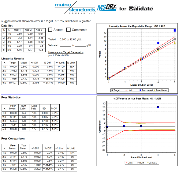 Peer Group Analysis is automatically provided with the purchase of all VALIDATE® linearity and calibration verification kits. To be included in and receive Peer Group Analysis, you just need to select the Manufacturer's Reagent Description abbreviation (i.e. ALB2, ALBP, ALBm, etc.) when processing in the new system or when you fill out your data submission form. This is the only information needed to ensure that your results are included in, and are compared to, the proper peers.